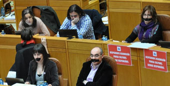 Amordazados con cintas adhesivas en la boca. Así evidenciaban los diputados del BNG en el Parlamento de Galicia lo que interpretan como un "silenciamiento" político, tras la aplicación del nuevo reparto de iniciativas en la Cámara gallega que propicia que el Grupo Mixto pueda interpelar al mandatario autonómico. Jorquera no ha podido formular la pregunta que había registrado. -