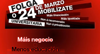 Profesores, personal de administración y servicios (PAS) y alumnos se manifiestan en Galicia durante la jornada de huelga convocada en el sistema universitario gallego (SUG) en contra de la reforma de la universidad y el conocido como "decreto del 3+2". La capital de Galicia acogió una de las principales movilizaciones en rechazo a la reforma de las titulaciones planteada por el Gobierno central que abre la puerta a la implantación de grados de 3 años y máster de 2. El conselleiro de Educación reduce el debate a "cuestiiones organizativas", mientras que PSdeG y BNG apoyan la huelga.