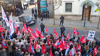 Unas 1.500 personas han protestado a las puertas del Parlamento gallego en contra de la "imposición" de recortes en la Administración, coincidiendo con el debate de la Ley de medidas temporales para empleados públicos que se aprobó por lectura única con los únicos votos a favor del PP -que tiene mayoría absoluta en el hemiciclo- y el rechazo de la oposición -PSdeG y BNG-. Unos 1.500 empleados públicos protestan ante el Parlamento y CC.OO. y UGT anuncian que habrá huelga general unitaria en Galicia. -
